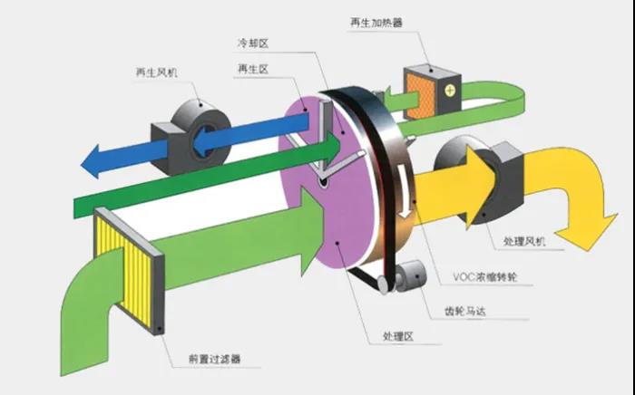 廢氣處理沸石轉(zhuǎn)輪吸附濃縮設(shè)備就結(jié)構(gòu)和功能而言,可分為三個(gè)部分:轉(zhuǎn)輪預(yù)處理部分,沸石轉(zhuǎn)輪濃縮部分和廢氣焚化室部分。 1. 轉(zhuǎn)輪預(yù)處理部分 轉(zhuǎn)輪預(yù)處理分為溫度和濕度控制和過(guò)濾部分。 溫濕度調(diào)節(jié)主要針對(duì)使用文丘里水簾處理前處理后的廢氣后排出的低溫高濕特性(溫度20℃?30℃,濕度80%?95%)。 噴漆車(chē)間的噴漆房。 濕法在進(jìn)入轉(zhuǎn)輪之前會(huì)升高空氣的溫度,并降低空氣中的水分含量,以達(dá)到轉(zhuǎn)輪最佳的吸附溫度和濕度(溫度40°C,濕度<90%)。 過(guò)濾部分結(jié)合使用不同等級(jí)的過(guò)濾器,以去除進(jìn)入轉(zhuǎn)輪的大顆粒物,因此轉(zhuǎn)輪可以處理VOC。 2.沸石轉(zhuǎn)輪濃縮部分 沸石轉(zhuǎn)輪部分根據(jù)功能,吸附區(qū),解吸區(qū)和冷卻區(qū)分為三個(gè)區(qū)域。 驅(qū)動(dòng)馬達(dá)通過(guò)鏈條驅(qū)動(dòng)器驅(qū)動(dòng)轉(zhuǎn)輪旋轉(zhuǎn),并通過(guò)調(diào)節(jié)轉(zhuǎn)輪的速度來(lái)調(diào)節(jié)沸石轉(zhuǎn)輪的加工效率。 吸附區(qū)過(guò)濾車(chē)間廢氣,并使用沸石轉(zhuǎn)輪吸附,以吸附廢氣中的苯,甲苯,二甲苯,乙酸乙酯,甲乙酮,異丙醇和醚,達(dá)標(biāo)氣體經(jīng)過(guò)濾后直接排出; 轉(zhuǎn)輪在高溫回風(fēng)的作用下,解吸區(qū)的溫度約為200℃轉(zhuǎn)輪破壞了轉(zhuǎn)輪中分子之間的范德華力和靜電吸引。 VOC被濃縮到原始?xì)怏w的5-20倍的高濃度氣體中。 冷卻區(qū)使用低溫風(fēng)冷卻轉(zhuǎn)輪溫度,以進(jìn)行下一階段的廢氣吸附。