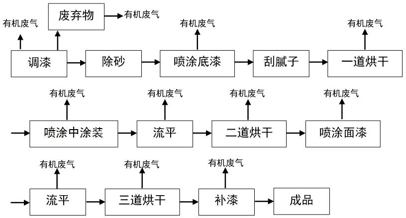 裝備制造涂裝生產(chǎn)過程中,產(chǎn)生VOCs廢氣的環(huán)節(jié)主要包括調(diào)漆、噴涂、流平、烘(晾)干等。