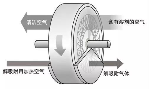過濾后的大流量的低濃度有機廢氣被送至轉(zhuǎn)輪吸附區(qū),轉(zhuǎn)輪可根據(jù)廢氣處理量,以1~6轉(zhuǎn)/小時的速度持續(xù)緩慢旋轉(zhuǎn)。廢氣中含有的VOCs被截留吸附在轉(zhuǎn)輪上的沸石分子篩內(nèi)部,凈化后的潔凈空氣則直接排放至大氣。轉(zhuǎn)輪持續(xù)旋轉(zhuǎn)吸附VOCs,逐漸趨向吸附飽和,當(dāng)轉(zhuǎn)輪旋轉(zhuǎn)進入至脫附區(qū)時,脫附風(fēng)機提供200℃左右的高溫?zé)峥諝?,將吸附在轉(zhuǎn)輪上的的VOCs脫附并帶走。脫附后的轉(zhuǎn)輪進入冷卻區(qū),經(jīng)冷卻空氣吹掃,恢復(fù)至常溫,沸石轉(zhuǎn)輪從而恢復(fù)吸附能力,再次旋轉(zhuǎn)至吸附區(qū),重新開始下一輪的工作。