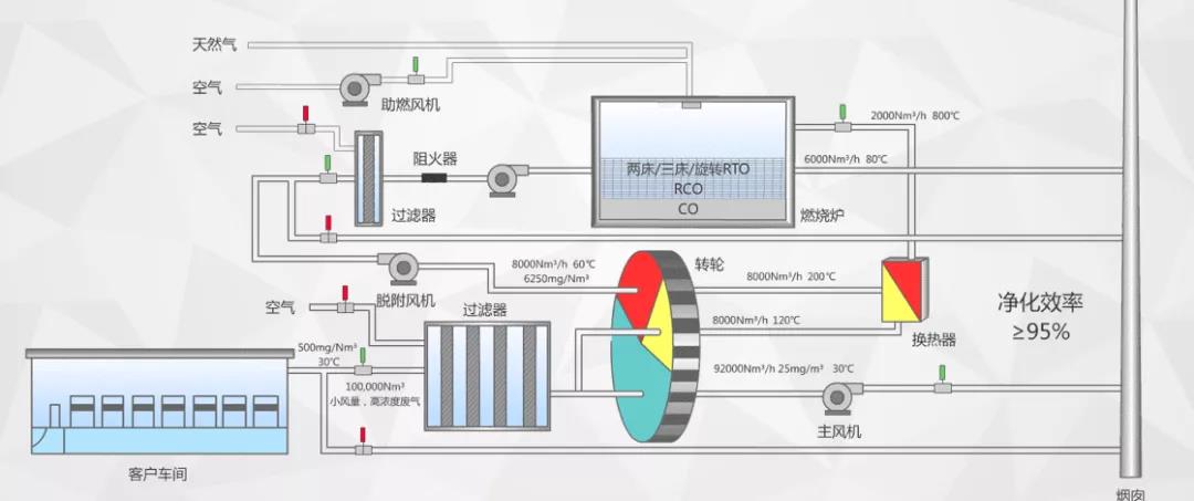 轉(zhuǎn)輪吸附的VOCs經(jīng)脫附后,隨脫附熱空氣送往RTO進行凈化處理。由于廢氣中的VOCs被濃縮了5~20倍,因此,需要最終處理的有機廢氣具備了濃度高、風(fēng)量小、溫度高的特點,這樣就可以根據(jù)風(fēng)量大小、氣體濃度大小來設(shè)計合理的濃縮比及相應(yīng)的轉(zhuǎn)輪、RTO 大小。RTO焚燒產(chǎn)生的一部分熱能可用于轉(zhuǎn)輪脫附空氣的加熱;末端排放的高溫?zé)煔饪蛇M行余熱回收,進一步做到節(jié)能、環(huán)保。
