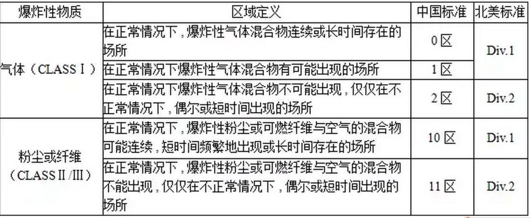 美國和加拿大首先將散布在空氣中的爆炸性物體分成三個 CLASS( 類別 ):CLASSⅠ氣體和蒸氣 ; CLASS Ⅱ 塵埃 ; CLASS Ⅲ纖維 .然后再將氣體和塵埃分成 Group( 組 ) :