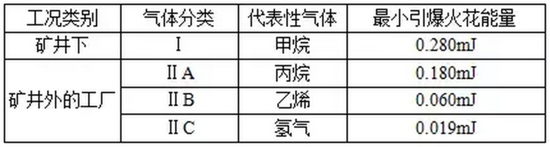 根據可能引爆的最小火花能量,我國和歐洲及世界上大部分國家和地區(qū)將爆炸性氣體分為四個危險等級, 如下表 :