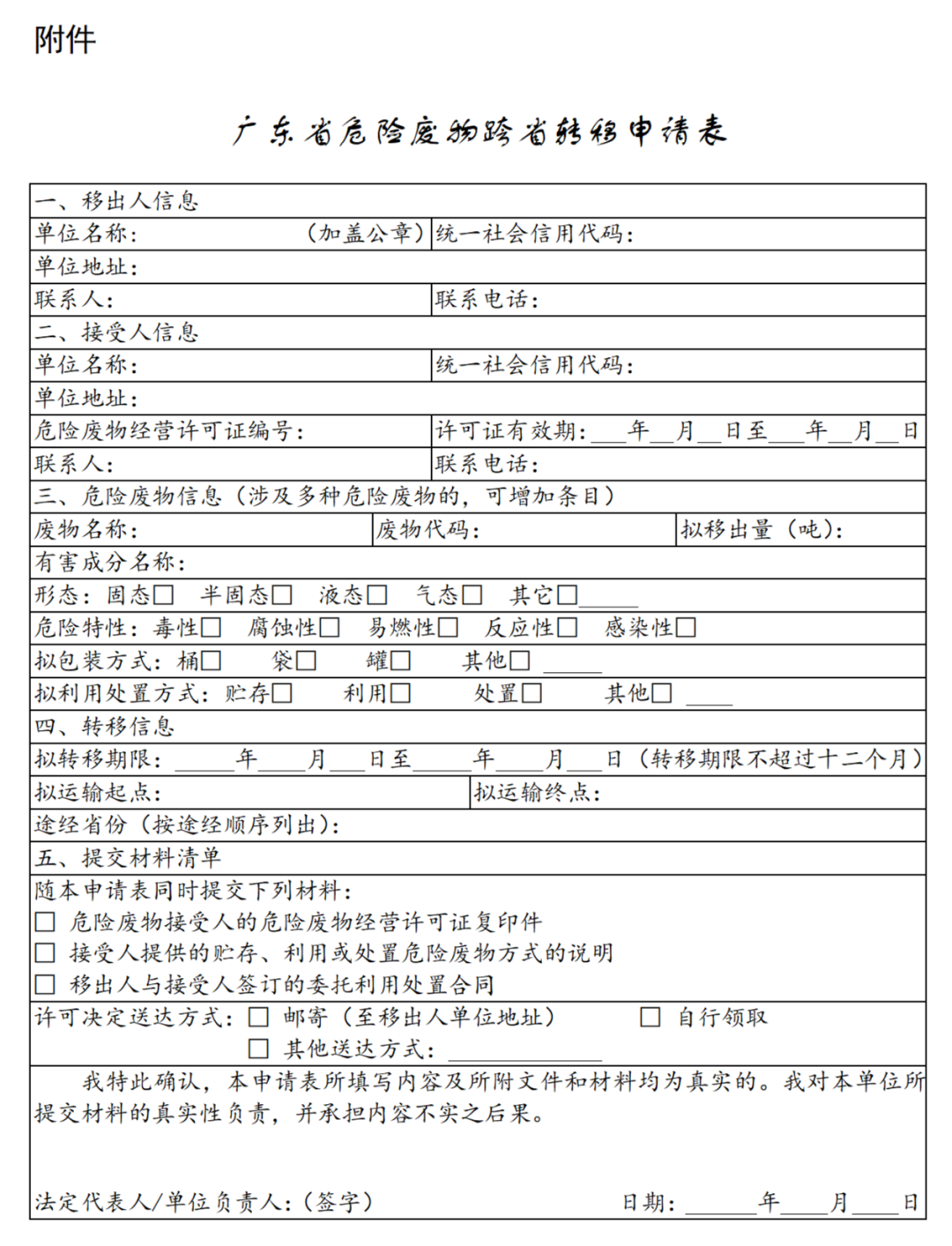 (1)《廣東省危險(xiǎn)廢物跨省轉(zhuǎn)移申請(qǐng)表》(見(jiàn)附件);