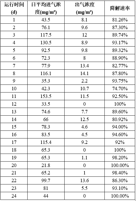 該項(xiàng)目連續(xù)監(jiān)測(cè)24天,進(jìn)氣濃度最高為243.5mg/m³,處理效率維持在85%以上,出氣濃度一直低于15 mg/m³(滿足《GB 31572-2015 合成樹(shù)脂工業(yè)污染物排放標(biāo)準(zhǔn)》執(zhí)行標(biāo)準(zhǔn)),可以實(shí)現(xiàn)穩(wěn)定達(dá)標(biāo)排放。
