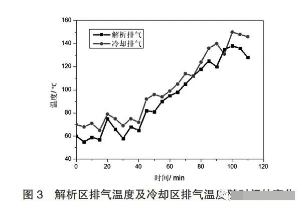 因此,通常情況下,各反應(yīng)區(qū)進(jìn)、出氣端均設(shè)置有溫度監(jiān)控裝置及溫度異常報(bào)警裝置,通過對(duì)各路氣體溫度實(shí)時(shí)監(jiān)測(cè),并及時(shí)反饋和控制,進(jìn)而保證整個(gè)處理工藝的穩(wěn)定運(yùn)行。但是,在實(shí)際監(jiān)測(cè)過程中,轉(zhuǎn)輪解析區(qū)及冷卻區(qū)排氣溫度偶爾會(huì)出現(xiàn)如圖3所示。系統(tǒng)剛開始運(yùn)行(0~40min)時(shí),解析區(qū)排氣溫度始終維持在50~80℃,而冷卻區(qū)排氣溫度始終維持在60~90℃。當(dāng)運(yùn)行至45min時(shí),解析區(qū)與冷卻區(qū)溫度開始持續(xù)升高。至75min時(shí),解析區(qū)排氣溫度高于110℃,至80min時(shí),冷卻區(qū)排氣溫度高于120℃,并且高于相應(yīng)溫度時(shí)間持續(xù)5min以上,若發(fā)生這種現(xiàn)象,則推斷認(rèn)為分子篩濃縮轉(zhuǎn)輪內(nèi)部發(fā)生燜燒,需要及時(shí)拆開檢查,并對(duì)可能導(dǎo)致該現(xiàn)象發(fā)生的原因進(jìn)行排查。因此,溫度判定法是一種最直接、有效的判定分子篩轉(zhuǎn)輪內(nèi)部發(fā)生燜燒現(xiàn)象的方法。