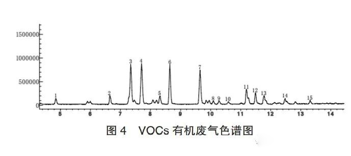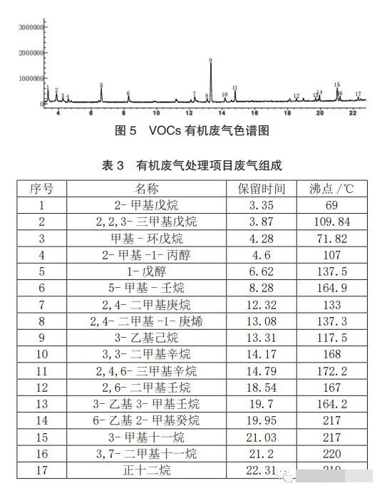 浙江某制藥廠生產(chǎn)車間有較明顯的異味,對(duì)該車間通風(fēng)換氣,產(chǎn)生大量的低濃度廢氣。2017年,該公司為保證排氣達(dá)標(biāo),采用了一套分子篩濃縮轉(zhuǎn)輪處理裝置。該裝置運(yùn)行兩年后在拆機(jī)檢修時(shí),發(fā)現(xiàn)轉(zhuǎn)輪輪芯表面存在灼燒痕跡。為查詢輪芯灼燒原因,對(duì)該項(xiàng)目廢氣進(jìn)行氣相色譜-質(zhì)譜檢測(cè),分析結(jié)果如圖5及表3所示。從數(shù)據(jù)分析看,該項(xiàng)目有機(jī)廢氣中含有高沸點(diǎn)(高于180℃)的有機(jī)廢氣分子,如6-乙基2-甲基癸烷(沸點(diǎn)217℃)、3-甲基十一烷(沸點(diǎn)217℃)等。這些物質(zhì)在常規(guī)解析溫度下無法發(fā)生解析,而本項(xiàng)目所設(shè)計(jì)的解析溫度為150~180℃。