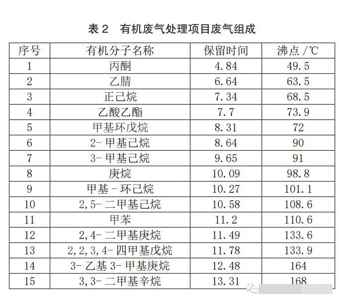 湖北某制藥公司于2019年對(duì)合成車間散排廢氣及污水池廢氣使用了一套分子篩濃縮轉(zhuǎn)輪處理裝置,該項(xiàng)目轉(zhuǎn)輪在運(yùn)行一年后拆機(jī)檢修時(shí),發(fā)現(xiàn)轉(zhuǎn)輪輪芯表面存在灼燒痕跡。為查詢輪芯灼燒原因,對(duì)該項(xiàng)目廢氣進(jìn)行氣相色譜-質(zhì)譜檢測(cè),分析結(jié)果如圖4及表2所示。從數(shù)據(jù)分析看,該項(xiàng)目有機(jī)廢氣中含有大量低沸點(diǎn)(低于100℃)的有機(jī)廢氣分子,如丙酮、乙腈等。為滿足沸點(diǎn)較高的有機(jī)物(如3-乙基3-甲基庚烷(164℃)、3,3-二甲基辛烷(168℃))的正常解析,設(shè)計(jì)該工藝解析溫度為150~180℃。當(dāng)進(jìn)氣中低沸點(diǎn)有機(jī)分子在轉(zhuǎn)輪上不斷吸附濃縮時(shí),在較高的解析溫度(150~180℃)下,這些有機(jī)分子就會(huì)與氣體中的氧氣發(fā)生氧化反應(yīng),并放出大量的熱,因此會(huì)直接導(dǎo)致分子篩濃縮轉(zhuǎn)輪內(nèi)部燜燒現(xiàn)象的發(fā)生。由此,可以解釋本項(xiàng)目轉(zhuǎn)輪輪芯發(fā)生燜燒現(xiàn)象的原因。