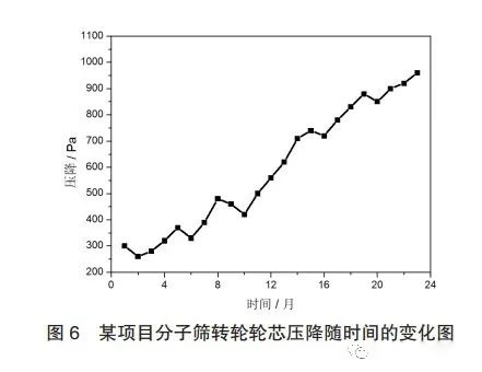 圖6為河北某化工原料生產(chǎn)車間有機(jī)廢氣處理工藝中監(jiān)測(cè)的分子篩轉(zhuǎn)輪輪芯運(yùn)行2年期間壓降隨時(shí)間的變化圖,從圖中可以看出,剛開始運(yùn)行(0~12個(gè)月)時(shí),轉(zhuǎn)輪壓降約200~500Pa,而運(yùn)行一年后,監(jiān)測(cè)的壓降明顯升高,最高達(dá)到1000Pa。對(duì)轉(zhuǎn)輪進(jìn)行停機(jī)檢查,發(fā)現(xiàn)輪芯盤面局部發(fā)生燜燒,同時(shí),發(fā)生燜燒區(qū)域的輪芯孔道也存在明顯的堵塞現(xiàn)象。由此可見,轉(zhuǎn)輪輪芯孔道堵塞可能是導(dǎo)致轉(zhuǎn)輪輪芯內(nèi)部發(fā)生燜燒的原因之一。分子篩轉(zhuǎn)輪輪芯主要是由吸附介質(zhì)(分子篩)和骨架結(jié)構(gòu)(陶瓷纖維)組成,其中陶瓷纖維及輪芯塊體之間使用密封膠黏連而成,因此在一定程度上容易造成骨架坍塌,進(jìn)而影響了輪芯結(jié)構(gòu)的穩(wěn)定性。另外,雖然分子篩轉(zhuǎn)輪輪芯具有規(guī)則的孔道,保證廢氣流通的同時(shí)能有效地降低壓損,節(jié)省能耗,但是,通常情況下,該孔道尺寸相對(duì)較小,容易造成孔道堵塞。此外,轉(zhuǎn)輪內(nèi)部容易引起孔道堵塞的物質(zhì)還包括: