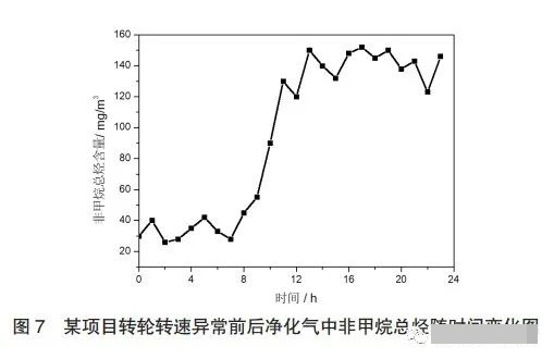例如,河北某制藥公司廢氣治理項(xiàng)目,系統(tǒng)運(yùn)行過程中曾出現(xiàn)轉(zhuǎn)輪轉(zhuǎn)速異常報(bào)警現(xiàn)象,并伴隨有轉(zhuǎn)輪凈化氣中非甲烷總烴數(shù)據(jù)超標(biāo)現(xiàn)象,如圖7所示。