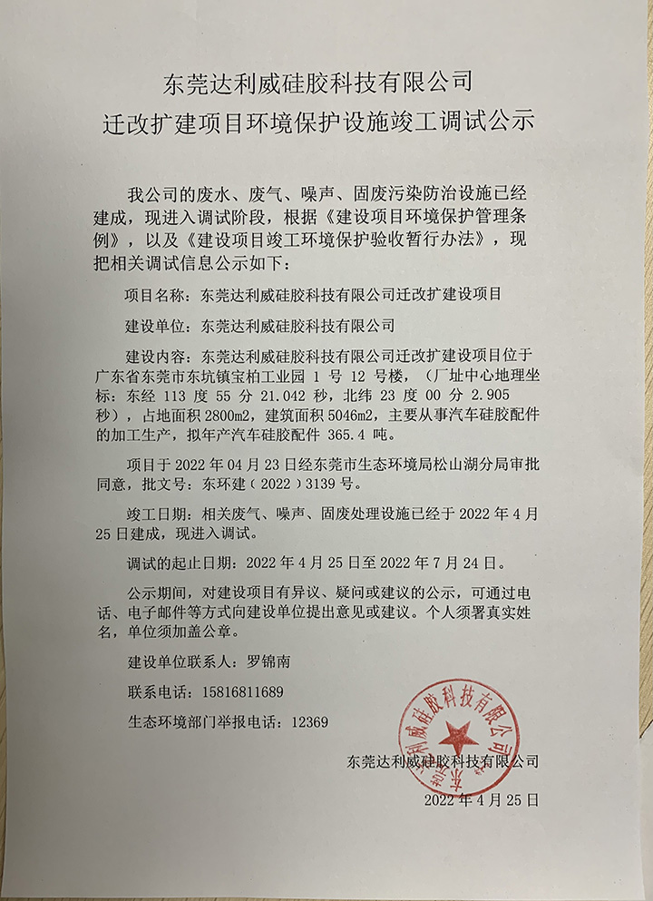 東莞達(dá)利威硅膠科技有限公司遷改擴(kuò)建項(xiàng)目環(huán)境保護(hù)設(shè)施竣工調(diào)試公示