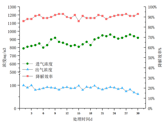 廢氣在經(jīng)過收集后進(jìn)入二級噴淋塔后,主要起到去除粉塵、調(diào)節(jié)溫度及pH的作用,隨后從生物滴濾系統(tǒng)底部進(jìn)入,有機(jī)廢氣在上升的過程中與循環(huán)液及填料表面的生物膜接觸,污染物分子首先被循環(huán)液及生物膜吸附,然后進(jìn)入微生物細(xì)胞被降解成CO2和H2O,凈化后的氣體從塔頂排出。含有微生物和營養(yǎng)鹽的循環(huán)液從塔頂向下噴淋,在填料層中自上而下流動,流回系統(tǒng)底部,再由循環(huán)水泵抽回塔頂。廢氣通過前端治理后最終排放。 此技術(shù)處理效率如下表顯示,在進(jìn)氣濃度為500~1000 mg/m³,出氣濃度在70~90 mg/m³ ,處理除率為 90 %左右,出氣達(dá)標(biāo)。由此看出生物法能夠?qū)υ撔袠I(yè)廢氣進(jìn)行有效處理,有望成為有機(jī)硅行業(yè)廢氣處理的解決方案。