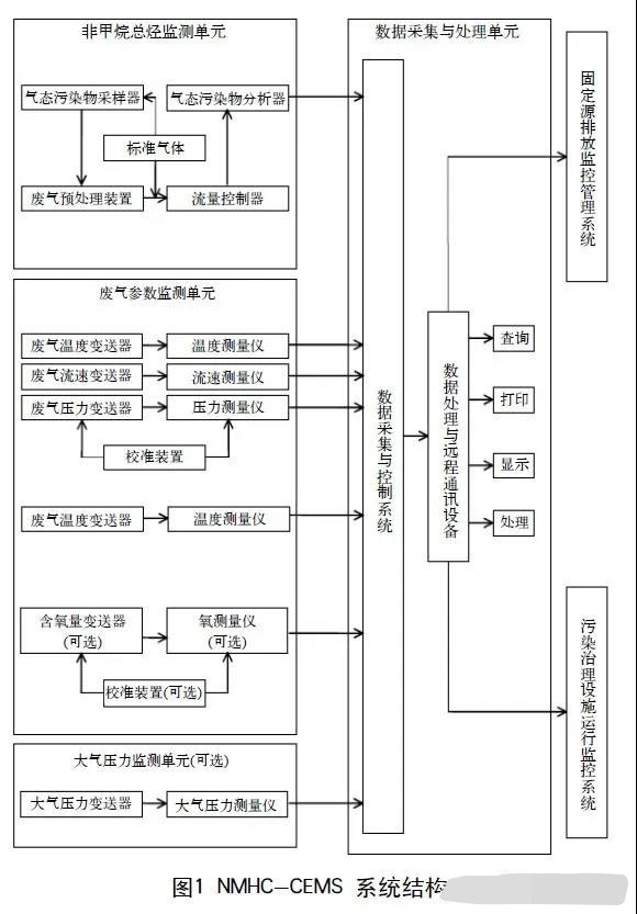非甲烷總烴連續(xù)監(jiān)測系統(tǒng)(nonmethane hydrocarbons continuous emissionmonitoring system, NMHC-CEMS),即連續(xù)監(jiān)測固定污染源廢氣中非甲烷總烴排放濃度和排放量所需的全部設(shè)備。系統(tǒng)依靠采樣探頭從排放管道內(nèi)取樣,經(jīng)高溫除塵后,通過高溫伴熱管線進入在線氣相色譜儀,經(jīng)過色譜分離后進入高靈敏度氫火焰離子化檢測器(FID)進行測量,最后通過系統(tǒng)軟件自動完成數(shù)據(jù)的采集、分析、處理、傳輸和存儲。 二、系統(tǒng)組成 NMHC-CEMS系統(tǒng)結(jié)構(gòu)主要包括樣品采集和傳輸裝置、預處理設(shè)備、分析儀器、數(shù)據(jù)采集和傳輸設(shè)備以及其他輔助設(shè)備等(如圖1所示)。依據(jù)系統(tǒng)測量方式和原理的不同,系統(tǒng)可能由上述全部或部分結(jié)構(gòu)組成。系統(tǒng)測量廢氣中總烴及甲烷濃度、廢氣參數(shù)(溫度、壓力、流速、流量等),其中非甲烷總烴濃度=總烴濃度-甲烷濃度,對含氧量參與污染物折算濃度計算的要同時測量含氧量。同時計算廢氣中污染物排放速率和排放量,顯示和統(tǒng)計各種參數(shù)、圖表,并可將數(shù)據(jù)傳輸至管理部門。