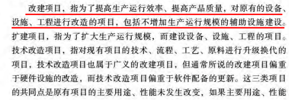 改建項目,指為了提高生產運行效率、提高產品質量,對原有的設備、設施、工程進行改造的項目,包括不增加生產運行規(guī)模的輔助設施建設。
