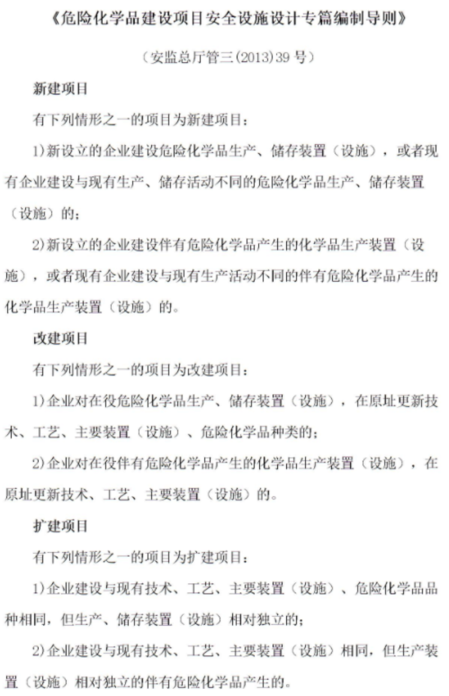 一、《辦法》所稱新建項目,指擬依法設立的企業(yè)建設伴有危險化學品產生的化學品或者危險化學品生產、儲存裝置(設施)和現(xiàn)有企業(yè)(單位)擬建與現(xiàn)有生產、儲存活動不同的伴有危險化學品產生的化學品或者危險化學品生產、儲存裝置(設施)的建設項目。