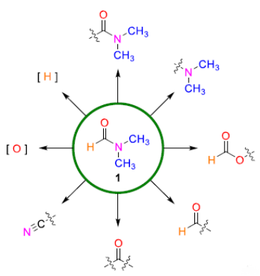 但是由于DMF的結(jié)構(gòu)中含有醛基和二甲胺基團(tuán),所以其同時(shí)在各種化學(xué)轉(zhuǎn)化的催化劑以及合成有機(jī)化學(xué)中許多官能團(tuán)的供體。