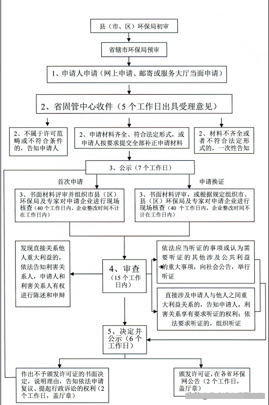 2、接到符合許可條件的材料或補正合格的材料后,省環(huán)保局在5個工作日內(nèi),組織省危廢中心及有關(guān)市環(huán)保局對申請單位的證明材料和現(xiàn)場進(jìn)行審查,對符合條件的,應(yīng)予以受理。對不符合條件的,書面通知申請單位并說明理由。