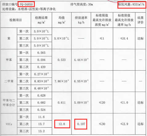 FQ-04850 VOCs排放速率(V)為0.107kg/h。