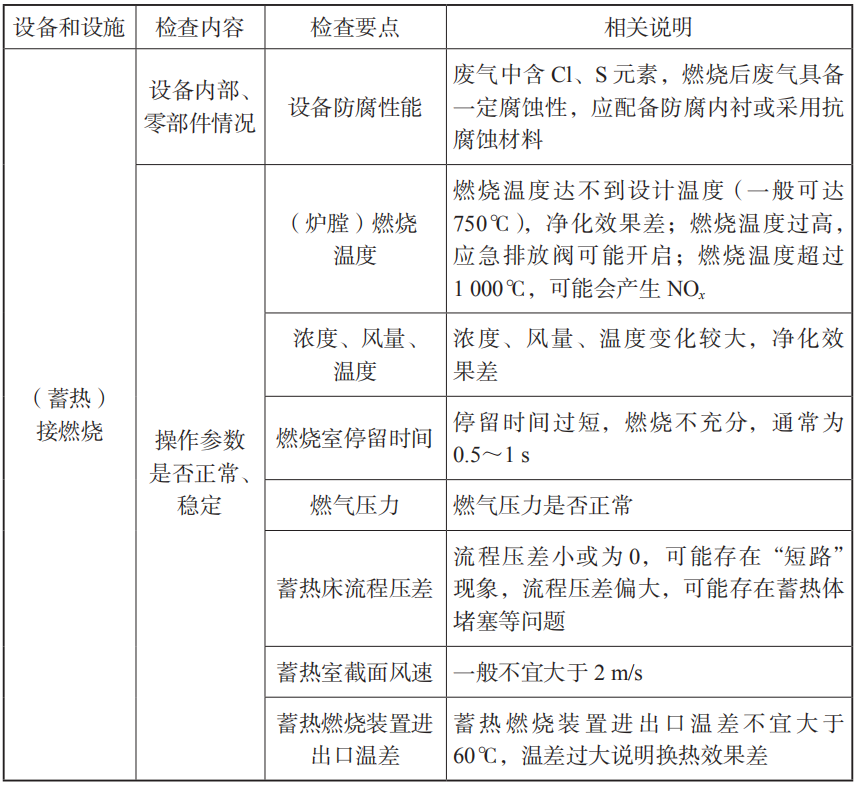 (a)預(yù)處理 進(jìn)入催化燃燒裝置前廢氣中的顆粒物含量高于10mg/m3時(shí),應(yīng)采用過(guò)濾等方式進(jìn)行預(yù)處理; 過(guò)濾裝置兩端應(yīng)裝設(shè)壓差計(jì),當(dāng)過(guò)濾器的阻力超過(guò)規(guī)定值時(shí)應(yīng)及時(shí)清理或更換過(guò)濾材料; 當(dāng)廢氣中有機(jī)物濃度較高時(shí),應(yīng)采用稀釋等方式調(diào)節(jié)至滿足要求。 (b)催化燃燒 催化燃燒在實(shí)際使用過(guò)程中,應(yīng)根據(jù)VOCs種類(lèi)不同,選擇不同的催化劑和控制相應(yīng)的反應(yīng)溫度。在實(shí)際使用中溫度應(yīng)控制在300℃~350℃; VOCs氧化催化劑應(yīng)有質(zhì)量檢驗(yàn)部門(mén)出具的合格證明,并符合《工業(yè)有機(jī)廢氣催化凈化裝置》(HJ/T389—2007)中關(guān)于催化劑性能的規(guī)定;催化劑的工作溫度應(yīng)低于700℃,并能承受900℃短時(shí)間高溫沖擊; 催化燃燒裝置的設(shè)計(jì)空速宜為10000h-1~40000h-1; 治理后產(chǎn)生的高溫?zé)煔庖诉M(jìn)行熱能回收。 (c)二次污染控制 當(dāng)催化燃燒后產(chǎn)生二次污染物時(shí)應(yīng)采取吸收等方法進(jìn)行處理后達(dá)標(biāo)排放。 ③蓄熱熱力燃燒裝置(RTO) (a)預(yù)處理 當(dāng)廢氣中含有酸、堿類(lèi)氣體時(shí),宜采用中和吸收等工藝進(jìn)行預(yù)處理; 當(dāng)廢氣中的顆粒物含量高于10mg/m3時(shí),應(yīng)采用過(guò)濾、洗滌、靜電捕集等方式進(jìn)行預(yù)處理; 過(guò)濾裝置兩端應(yīng)裝設(shè)壓差計(jì),當(dāng)過(guò)濾器的阻力超過(guò)規(guī)定值時(shí)應(yīng)及時(shí)清理或更換過(guò)濾材料。 (b)燃燒室 廢氣在燃燒室的停留時(shí)間一般不宜低于0.75s;燃燒室燃燒溫度一般應(yīng)高于760℃。 (c)蓄熱室 截面風(fēng)速不應(yīng)大于2m/s; 當(dāng)廢氣含有有機(jī)硅時(shí),應(yīng)對(duì)蓄熱體采取保護(hù)措施,避免或減緩蓄熱體堵塞和性能下降。 (d)燃燒器 輔助燃料應(yīng)優(yōu)先選用天然氣、液化石油氣等燃料; 燃燒器應(yīng)具備溫度自動(dòng)調(diào)節(jié)的功能,應(yīng)符合《工業(yè)燃油燃?xì)馊紵魍ㄓ眉夹g(shù)條件》(GB/T19839—2005)的規(guī)定; 優(yōu)先選用低氮燃燒器。 (e)工藝系統(tǒng)整體要求 固定式蓄熱燃燒裝置換向閥換向時(shí)間宜為60~180s,旋轉(zhuǎn)式蓄熱燃燒裝置氣體分配器換向時(shí)間宜為30~120s; 蓄熱燃燒裝置進(jìn)出口氣體溫差不宜大于60℃; 蓄熱燃燒裝置應(yīng)進(jìn)行整體內(nèi)保溫,外表面溫度不應(yīng)高于60℃,部分熱點(diǎn)除外; 環(huán)境溫度較低或廢氣濕度較大時(shí)宜采取保溫、伴熱等防凝結(jié)措施; 蓄熱燃燒裝置應(yīng)具有反燒和吹掃功能。 (f)后處理 當(dāng)處理含氮有機(jī)物造成煙氣氮氧化物排放超標(biāo)時(shí),應(yīng)進(jìn)行脫硝處理; 當(dāng)處理含硫有機(jī)物產(chǎn)生二氧化硫時(shí),應(yīng)采用吸收等工藝進(jìn)行后處理。 ④蓄熱催化燃燒裝置(RCO) (a)預(yù)處理 進(jìn)入催化燃燒裝置前廢氣中的顆粒物含量高于10mg/m3時(shí),應(yīng)采用過(guò)濾等方式進(jìn)行預(yù)處理; 過(guò)濾裝置兩端應(yīng)裝設(shè)壓差計(jì),當(dāng)過(guò)濾器的阻力超過(guò)規(guī)定值時(shí)應(yīng)及時(shí)清理或更換過(guò)濾材料; 當(dāng)廢氣中有機(jī)物濃度較高時(shí),應(yīng)采用稀釋等方式調(diào)節(jié)至滿足要求。 (b)催化燃燒 RCO的運(yùn)行溫度宜為300℃~500℃,應(yīng)根據(jù)廢氣成分及催化劑種類(lèi)而設(shè)定; VOCs氧化催化劑應(yīng)有質(zhì)量檢驗(yàn)部門(mén)出具的合格證明,并符合《工業(yè)有機(jī)廢氣催化凈化裝置》(HI/T389—2007)中關(guān)于催化劑性能的規(guī)定;催化劑的工作溫度應(yīng)低于700℃,并能承受900℃短時(shí)間高溫沖擊; 蓄熱催化燃燒裝置換向閥的泄漏率應(yīng)低于0.2%; RCO裝置的設(shè)計(jì)空速宜為10000h-1~40000h-1; 治理后產(chǎn)生的高溫?zé)煔庖诉M(jìn)行熱能回收。 (c)二次污染控制 當(dāng)催化燃燒后產(chǎn)生二次污染物時(shí)應(yīng)采取吸收等方法進(jìn)行處理后達(dá)標(biāo)排放。 b.運(yùn)行維護(hù)及臺(tái)賬記錄要求 ①燃燒裝置運(yùn)行維護(hù)要求見(jiàn)表3-8。