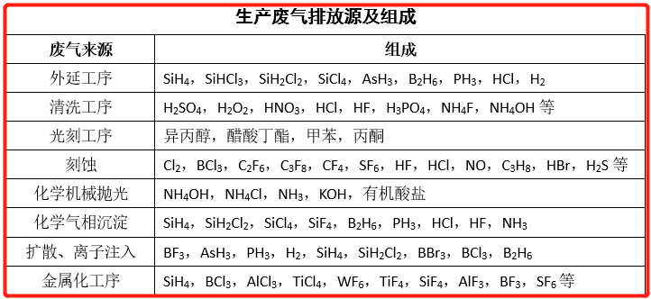 由于半導體工藝對操作室清潔度要求極高,通常使用風機抽取工藝過程中揮發(fā)的各類廢氣,因此半導體行業(yè)廢氣排放具有排氣量大、排放濃度小的特點。廢氣排放也以揮發(fā)為主。來源及成分如下表: