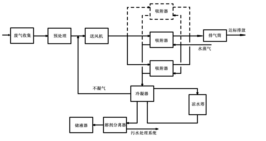 生產(chǎn)過(guò)程廢氣,先經(jīng)預(yù)處理裝置處理氣體中的一些高分子的物質(zhì)和空氣中的細(xì)小顆粒,再經(jīng)冷卻器將溫度平衡穩(wěn)定至45℃以下。經(jīng)處理后的廢氣進(jìn)入吸附-脫附操作單元,溶劑被高性能活性碳材料吸附,凈化后空氣穿透吸附材料后排放至大氣。被吸附的溶劑通過(guò)蒸汽(氮?dú)猓┙馕?。解吸出?lái)的有機(jī)溶劑進(jìn)入換熱器與冷卻水換熱,然后再經(jīng)冷凝為常溫液態(tài)后回收。經(jīng)廢氣凈化回收設(shè)備處理后排放的廢氣VOCs去除率在95%以上。整個(gè)工藝過(guò)程由PLC功能程序控制,自動(dòng)切換,交替進(jìn)行吸附、解吸、冷卻、間歇四個(gè)工藝過(guò)程。