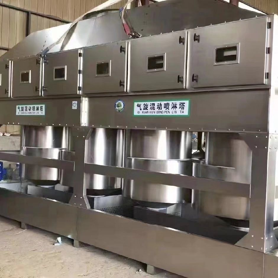 雙極氣旋噴淋塔又稱為多桶式旋流噴淋柜、混動式旋流噴淋塔、多桶混旋塔、多桶噴淋塔、氣旋柜、方形旋流噴淋塔、多桶混動旋流柜,也就是噴淋塔的升級版。 工作原理: 雙極氣旋噴淋塔由塔體、填料、液體分布器、氣水分離器、噴淋系統(tǒng)、循環(huán)水泵、循環(huán)水箱、藥劑儲存投加系統(tǒng)等單元組成。其工作原理是:當其有一定進氣速度的含塵氣體經進氣管進入后,氣流首先通過多套旋流裝置,旋流裝置上方安裝有噴淋裝置,氣流與吸收液在塔內作相對運動,并在旋流塔板的結構部位形成很大表面積的水膜,從而大大提高了吸收作用。煙氣在吸收塔內通過旋流氣動裝置的加速和旋流,煙塵與經過霧化的吸收液發(fā)生碰撞、附著、凝聚、離心分離等綜合性的作用,被甩到塔壁,隨塔壁水膜流向塔底。通過旋流氣動裝置的設置,使煙氣在同樣高度的筒體內旋轉次數增加、通過的路徑增長,氣相紊動劇烈,煙氣與吸收液在時間和空間上得到充分的碰撞、接觸、溶解和吸收。