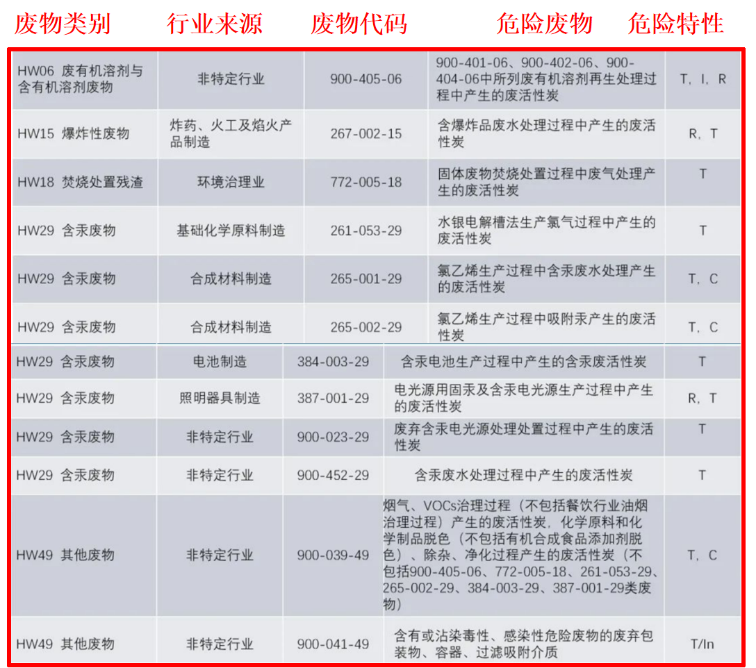 VOCs治理系統(tǒng)的廢活性炭,明確是危廢,特別在天量的活性炭箱體中的廢活性炭的更換中,一定要注意此處的合規(guī)!根據(jù)《國家危險(xiǎn)廢物名錄》(2021年版),列入目錄的廢活性炭共有11個(gè)類別,此外還有一個(gè)通用條款,即“含有或沾染毒性、感染性危險(xiǎn)廢物的廢棄包裝物、容器、過濾吸附介質(zhì)”屬危廢(代碼900-041-49)。