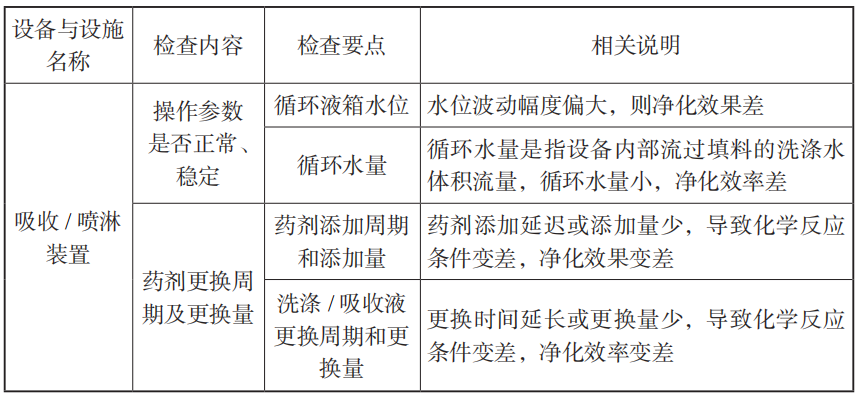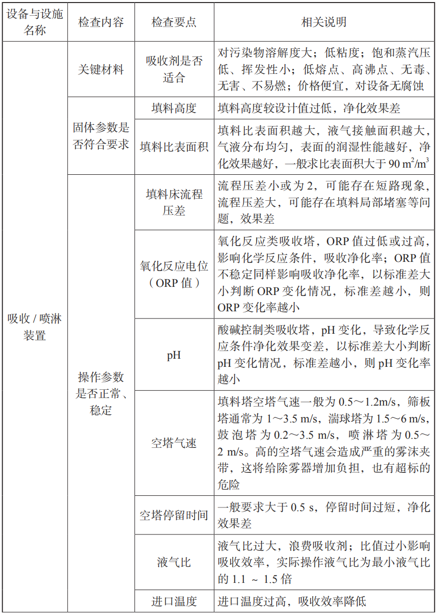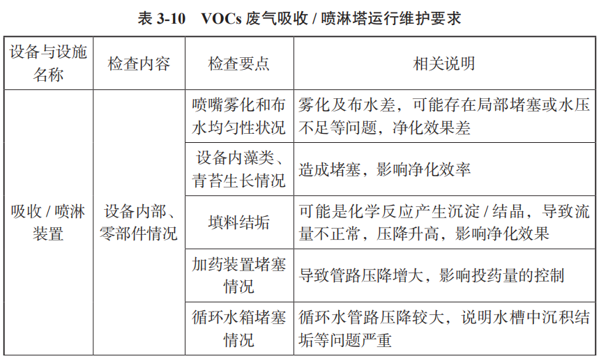 a.關(guān)鍵參數(shù) 選擇低揮發(fā)性或者不揮發(fā)、具有高吸收能力(較大吸收量與較快吸收速度)、低毒性、低生物降解性或者不可生物降解和成本低、設(shè)備腐蝕性小的吸收劑,使得凈化裝置對(duì)有機(jī)污染物的凈化效率不小于95%。填料塔空塔氣速控制在0.5~1.2m/s,篩板塔為1~3.5m/s,湍球塔為1.5~6m/s,鼓泡塔為0.2~3.5m/s,噴淋塔為0.5~2m/s??刂茝U氣在設(shè)備中的停留時(shí)間不低于0.5s。 一般酸性廢氣加NaOH,溶液濃度保持在2%~6%,pH控制在7~9;堿性廢氣加硫酸,pH控制在10~11。凈化裝置本體主體的表面溫度不高于60℃。 定期添加適量藥劑和吸收液,控制其吸收液濃度(pH),注意系統(tǒng)的防垢和堵塞、溫度、壓力、密封、泄漏等。 b.運(yùn)行維護(hù)及臺(tái)賬記錄要求 ①吸收/噴淋塔運(yùn)行維護(hù)要求見表3-10。