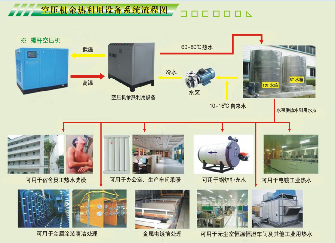 3、應(yīng)用范圍廣泛: 適合各類型,各品牌螺絲桿式空壓機節(jié)能改造,產(chǎn)生的熱水不僅可大量節(jié)約工廠燃油、燃?xì)饧半娰M,其熱水可用于生活用熱水,也可用于工業(yè)生產(chǎn)用熱水(如電鍍、清洗等用熱水)。