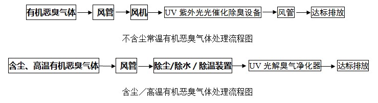 有機(jī)惡臭廢氣氣體經(jīng)紫外光光催化除臭設(shè)備處理流程圖