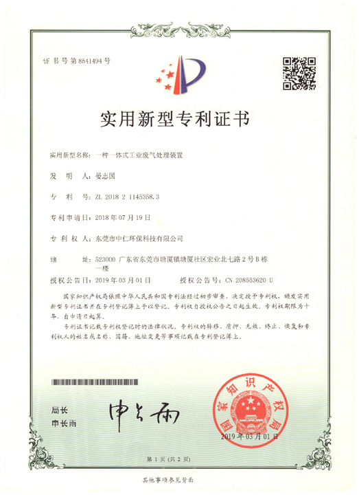 實(shí)用新型專利證書(shū)(一體式工業(yè)廢氣處理裝置)