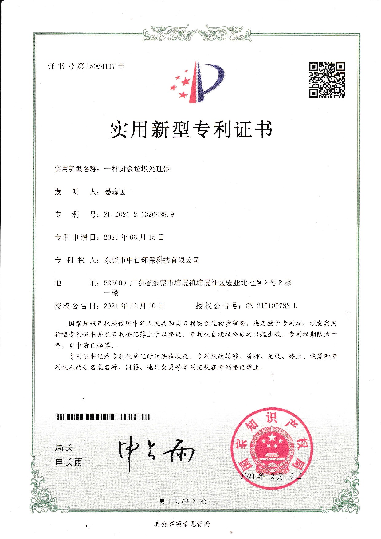 實用新型專利證書(廚余垃圾處理器)